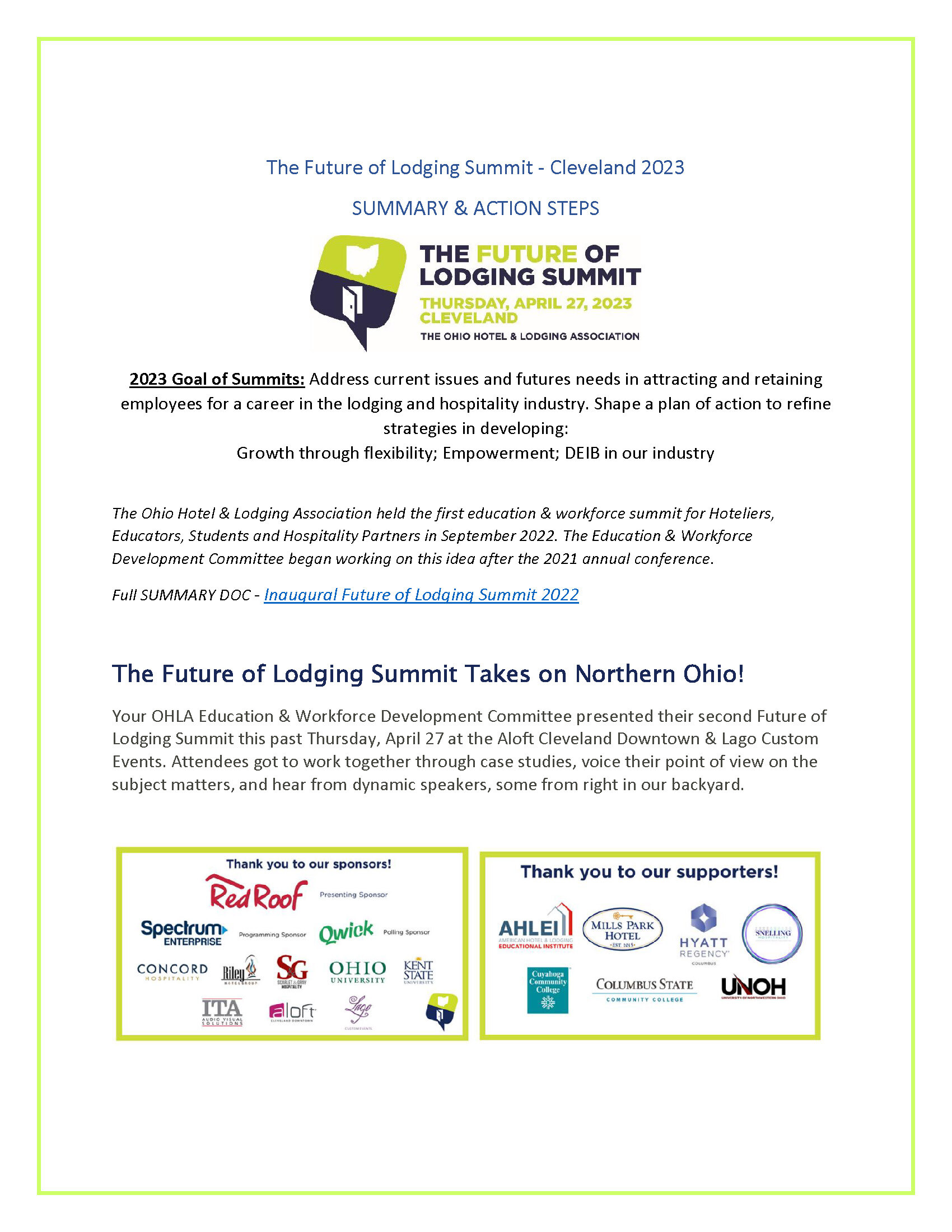 The Ohio Hotel & Lodging Association held the first education & workforce summit for Hoteliers, Educators, Students and Hospitality Partners in September 2022. The Education & Workforce Development Committee began working on this idea after the 2021 annual conference.